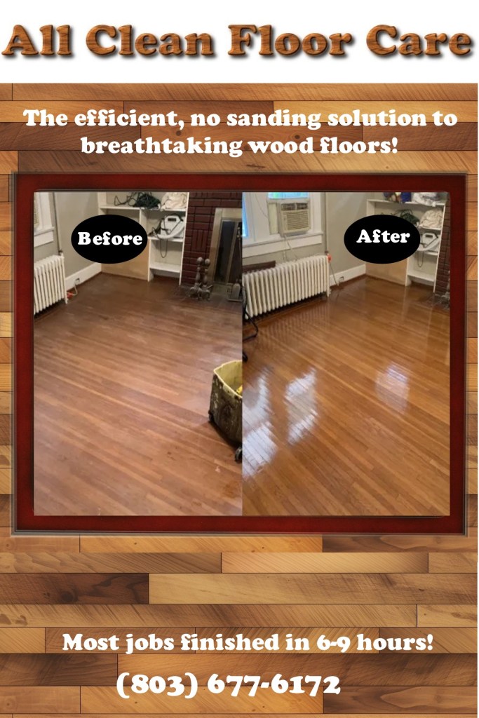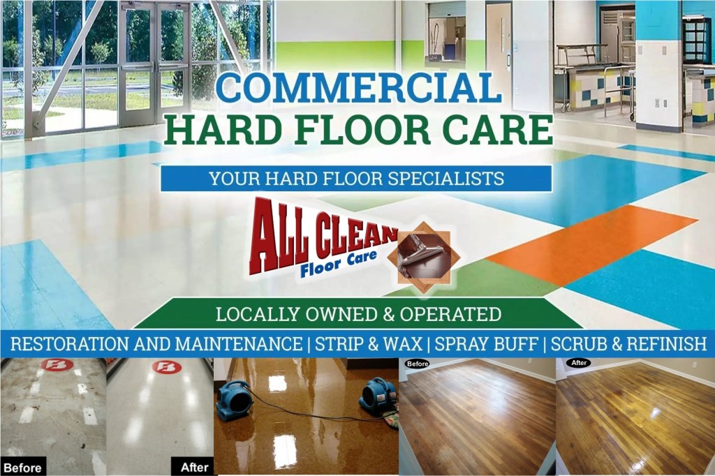 All Clean Floor Care, LLC is a commercial floor refinishing and restoration service. We possess over 40 years of experience in hardwood floor refinishing, engineered wood floor refinishing, vinyl commercial tile (VCT) strip and refinish, luxury vinyl plank (LVP) clean and seal, laminate floor clean and seal, commercial carpet cleaning and commercial upholstery cleaning. We offer free estimates, volume, senior, military and non-profit discounts and service the Greater Columbia area, including: Blythewood, Camden, Cayce, Chapin, Elgin, Irmo, Lexington and West Columbia.